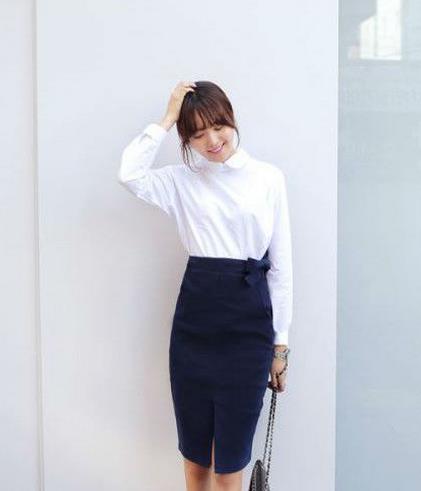 通常大家都喜欢选择黑色袜子搭配蓝色裙子,容易搭配又有不错的效果,不过除了黑色,其他颜色也有不错的效果哦。比如这款藏蓝色包臀半身裙搭配白色衬衫,清新又有气质,若搭配黑色袜子,会显得过于清素,若一条选择暗红色或咖啡色袜子,整体视觉效果就会比较出挑。