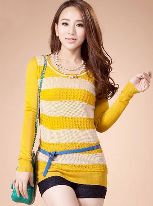 秋季搭配很容易在大地色系与深色系中走入呆板沉闷的死胡同,恰当运用亮色可以让浓郁的秋色不在肌肤上显现。在沉稳时尚的黑色小西装里面,搭配一件明黄与米白间隔的条纹打底衫,时尚又抢眼。