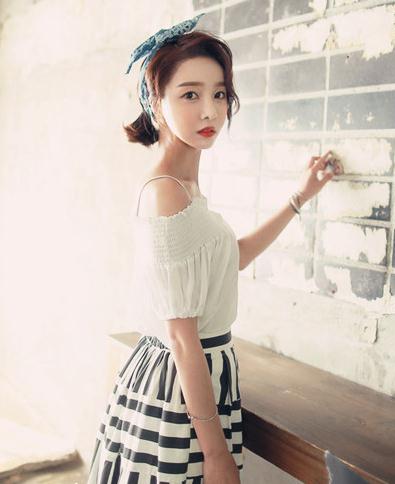 搭配看点:清纯的白色一字领露肩上衣极具少女气息,搭配黑白条纹伞裙简约又不失时尚感,韩范儿十足。将头发用清新的发箍随意盘起,化个精致的淡妆,再搭配一款mini链条包或复古方型手提包,绝对是假期最完美的出游装扮哦。