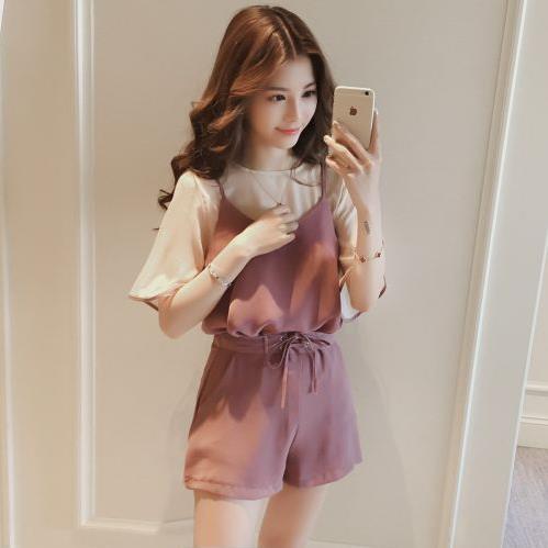 2017春夏季新款韩版雪纺衫+吊带背心休闲套装女装短裤时尚三件套