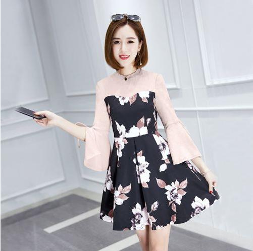 2017新款韩版收腰印花显瘦胖妹妹a字连衣裙