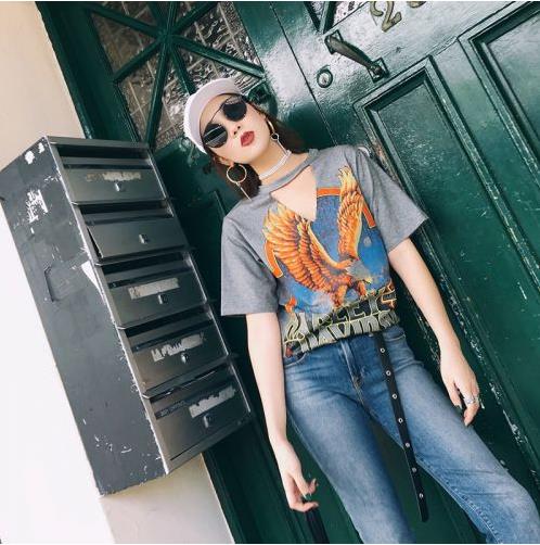 老鹰印花短袖T恤挂脖V领宽松内搭打底衫个性潮牌女装