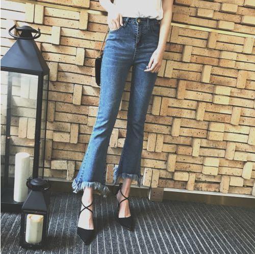 春季新款韩版不规则流苏微喇叭裤毛边高腰九分阔腿牛仔长裤女