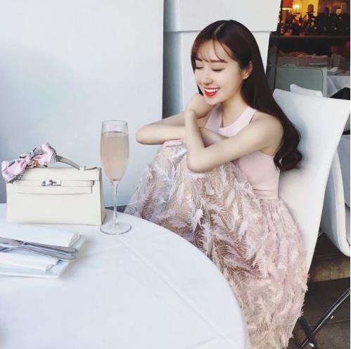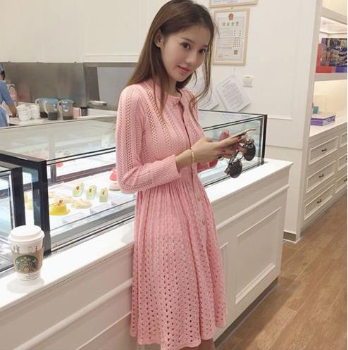 2017春装新款女装明星同款收腰显瘦大摆镂空A字裙粉色针织连衣裙