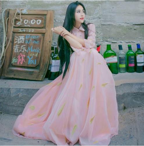 新品浅粉色重工羽毛刺绣长裙文艺复古仙女气质度假连衣裙