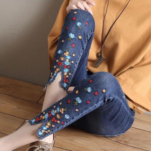 2017韩版高腰显瘦小脚裤刺绣牛仔裤女九分裤春夏新款9分开叉女裤
