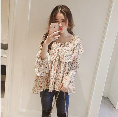 圆领荷叶边喇叭袖小碎花雪纺衫女上衣显瘦印花娃娃衫