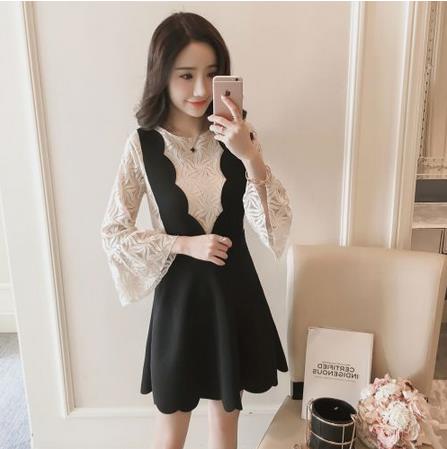 厚度适中,优质的蕾丝+棉混纺面料,蕾丝衫有内衬(袖部无),两件套合身版型,里层为圆领蕾丝衫,时尚优雅的圆领大小适中,衬托得脖子尤显优雅修长,领后一粒扣水滴式收襟,彰显简约小性感,荷叶九分袖,展现出了女性的柔美气质,纯色系,全身一体的精致剪裁工艺,简约时尚,甜美秀丽,尽显青春活力,外层为高腰背带连衣裙。