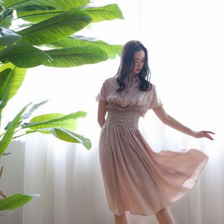 春季新品晚晚女甜美优雅高腰藕粉色风连衣裙芭蕾少女