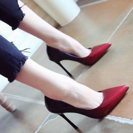 渐变色的高跟鞋很有特色,很随意的两种颜色形成一种渐变的效果,总是能给人眼前一亮的感觉,当然这款酒红色的高跟鞋穿上脚特别显白呢。