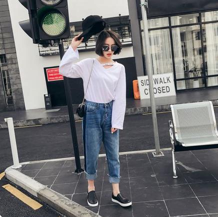 镂空V领白色长袖t恤鸡心领衣服女春装2017新款潮学生韩版打底衫