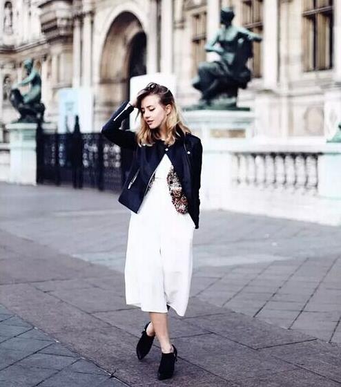 再有就是选择5分、7分、9分的阔腿裤,Sarah穿了一条连身阔腿裤,再利用短外套分割全身,打造腰线。