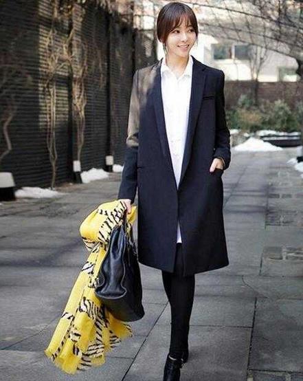 韩版时尚中长款黑色小西装搭配白色衬衫很有感觉,配上黑色打底裤和时尚鱼嘴靴,很适合冬季的潮流穿搭,帅气又好看。