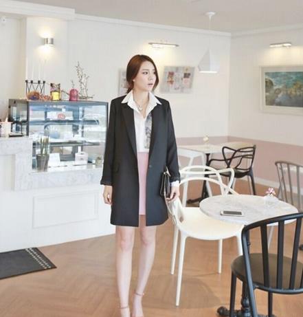 黑色的中长款西装总给人一种正式而且“老气”的感觉,但是它的显瘦功能又让许多宝宝们趋之若鹜,那么搭配就变得尤为重要。穿上一条粉嫩的半身包臀裙,严肃深沉的黑色立马就变得妩媚俏皮起来。