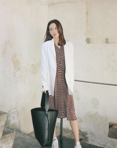 西装和连衣裙的混搭,有种清新自然的味道,简单好看不失优雅气质。简约的西装外套和小碎花形成对比,并且立长外端打造层次感,最吸引眼球。