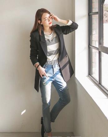 黑色的中长款西装对于其他服饰来说,多了更多的正式严肃感,所以许多女生一不小心就容易穿出售楼小姐的味道。这个时候搭配一条随性的牛仔裤是最好的,无需过多的单品,简约有型又有范儿。