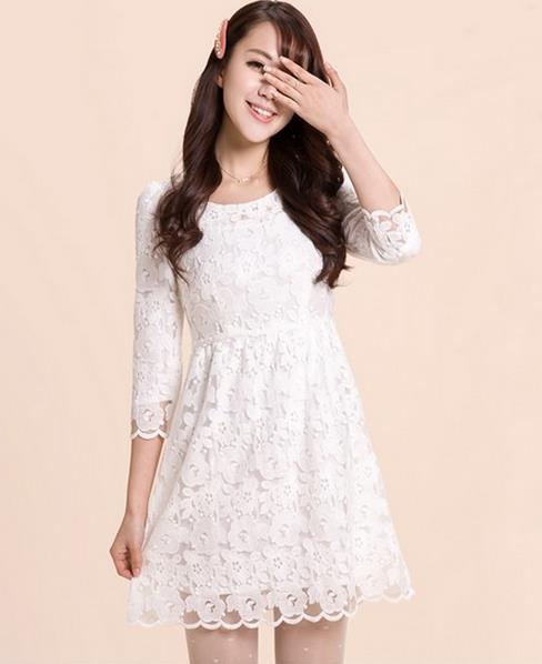 武侠剧里总有一个穿着白衣的姑娘,就算武功不咋滴,相貌也一定是一等一的,于是白色也成了美女的一个标志。蕾丝花朵的隐约之美其实并不妨碍连衣裙俏皮的模样,裙摆并不飞扬可是青春就是那么明晰。