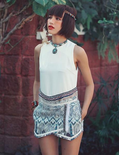 将短裤玩出别具一格的花样?肯定不止字母与流苏,民族风也来贡献一己之力。繁复的花型+做旧的颜色+不规则的裁剪,似乎在向我们诉说少数民族的奇闻异事,悠远而神秘。