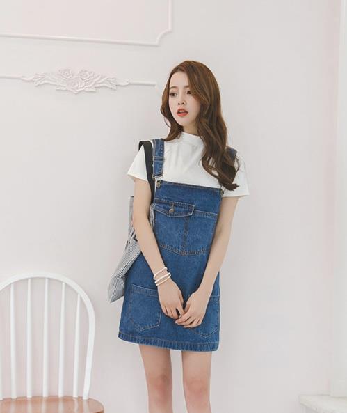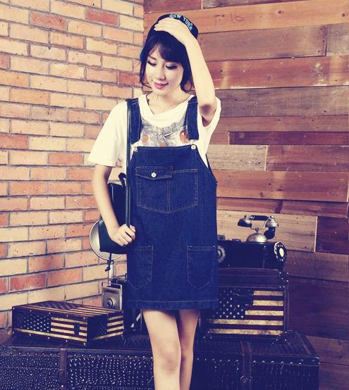 搭配看点:这就是这个夏天最美的搭配之一,牛仔背带裙搭白T,再配上一双白色平底鞋,一顶棒球帽,一副圆框墨镜,舒适又十分清新抢镜哦。