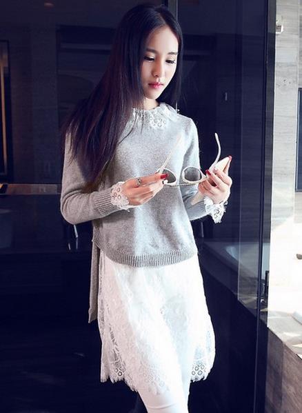 毛衣衬衫叠搭在复古与潮流之间存在已久,蕾丝与毛衣刷新了混搭印象,不舍蕾丝的美丽,把它带到秋天里,洁白的梦幻在不规则毛衣下摆、袖口和领间绽放,给露出的肌肤以花韵许诺。