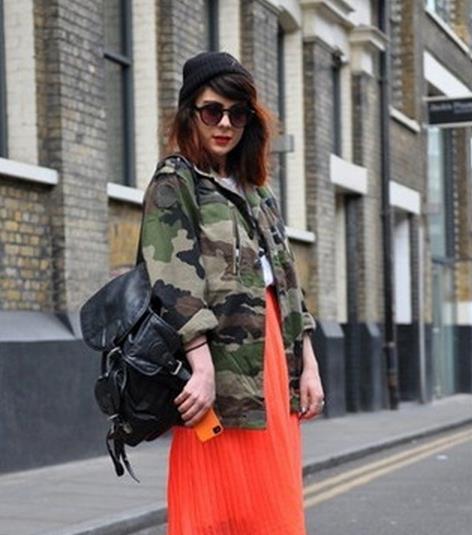 迷彩外套春日重回时尚舞台,内搭上T恤和橘色的雪纺裙,大玩女性柔美和帅气的型格融合范!