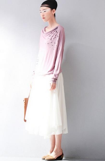 衣袖如哈伦裤那般从上到下慢慢收紧,但是在衣身部分完全没有做收缩的处理,这样的上衣,小编更建议姑娘们像第二张模特图片这样进行穿搭,当然,如果你爱森女风的话,如第一张那样搭配也无妨。