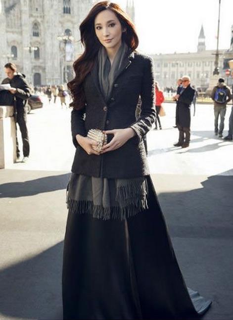 吴佩慈这样西装与大摆裙装的搭配将西装的女人味儿释放到极限,长围巾直接搭在颈间并让下摆从衣摆处露出,让西装与裙装之间的层次感立马变得分明。这种方法也适合胖姑娘来演绎,不过一定要身高足够才行哟!