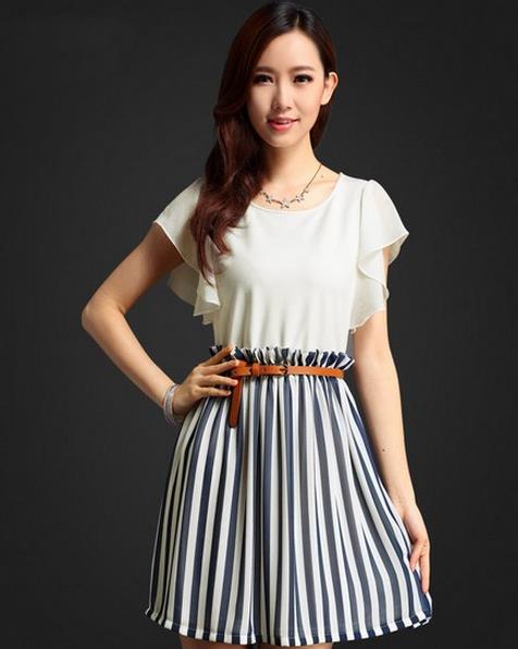 上半身的荷叶袖圆领白色雪纺并无甚亮点,简单却仙气飘飘,下半身的高腰显瘦竖条纹裙摆,紧跟时尚流行元素,更在腰间束出一截儿向上绽开的木耳边,更衬托出腰部曲线。简单优雅易搭配,最爱这种款儿。