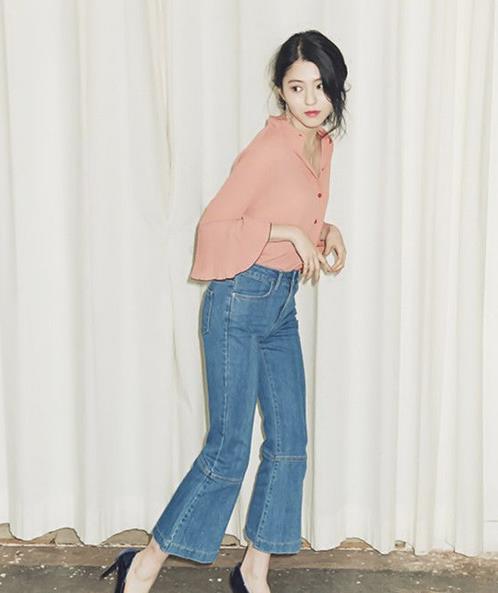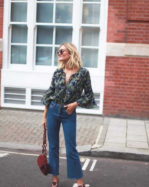 牛仔阔腿裤搭配印花上衣更前俏皮活力,尤其是带有喇叭袖的设计更是美艳又浪漫。
