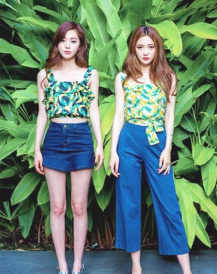 夏日最爱的就是印花了,蓝色牛仔阔腿裤搭配黄绿配色的印花吊带极具青春气质,穿上具有金属质感的厚底凉拖,轻松出街去撩汉。