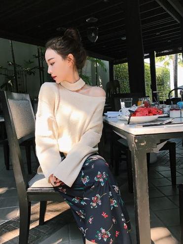 韩版挂脖镂空针织衫女套头长袖薄款宽松百搭上衣