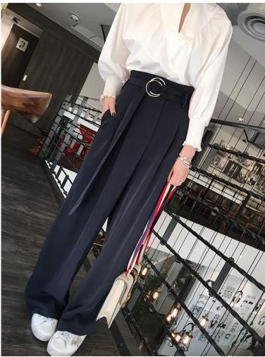 韩版学生宽松显瘦高腰阔腿裤女休闲系带长裤子