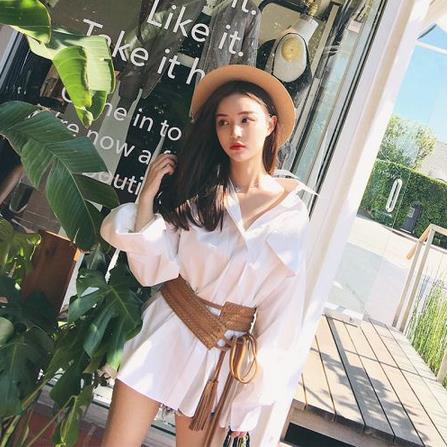 韩范系带宽松白衬衫女长袖中长款百搭学生衬衣