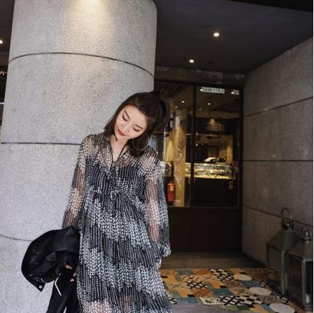 新品女人味仙儿黑白雪纺碎花长款连衣裙春秋两件套春装女