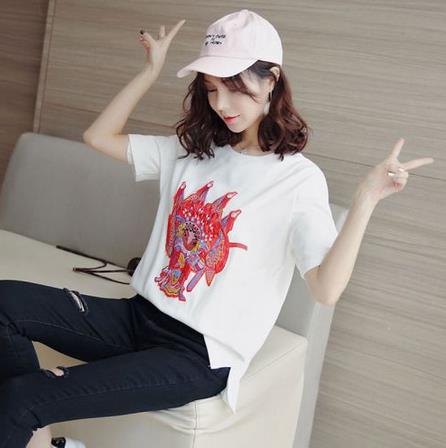 大码女短袖 磨毛棉体恤 新款个性胖mm刺绣开叉短袖上衣