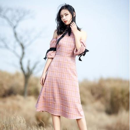 性感挂脖露肩纯棉粉色泡泡袖绑带裹胸格子连衣裙