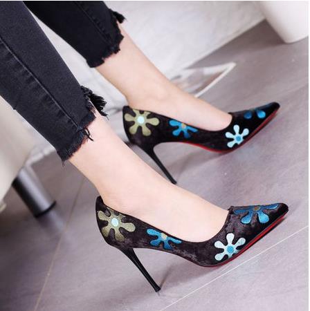 新款浅口拼色尖头高跟鞋绣花紫色性感细跟单鞋