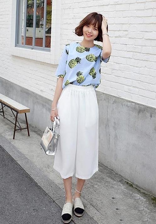菠萝图案浅蓝色短袖T恤搭配白色阔腿裤,两件单品都是雪纺材质,穿在身上轻盈舒服,很有浪漫气息,尤其是炎热的夏季,穿雪纺很清凉呢,搭配黑白拼色平底鞋,拎着银色手袋,可爱温柔。