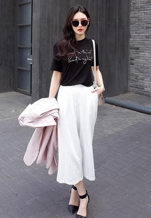 黑色短袖T恤搭配白色阔腿裤,将上衣的衣摆扎进裤腰里,营造高挑感,呈现完美身材比例,搭配黑色高跟鞋,尽显干练优雅气质。经典不把的黑白搭配永远不过时。