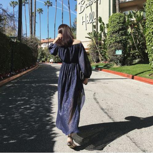 这个藏蓝底星空印花裙真是自带发光体啊!视觉上充满璀璨闪耀幻想远观既神秘又超现实的浪漫美好~星空与连衣裙的结合就像把一片星空穿在了身上!一种惊艳又梦幻的美丽!~面料也运用了特制印花!浪漫的星空印花经过特别的处理,带有条纹感!这是一个气质款!高腰的设计加上前开叉,这两个设计点可圈可点缺一不可~正是这款星空裙的一大设计点!还有就是一字肩的设计也是画龙点睛之笔~整体性感大方充满仙气~令人一见倾心!