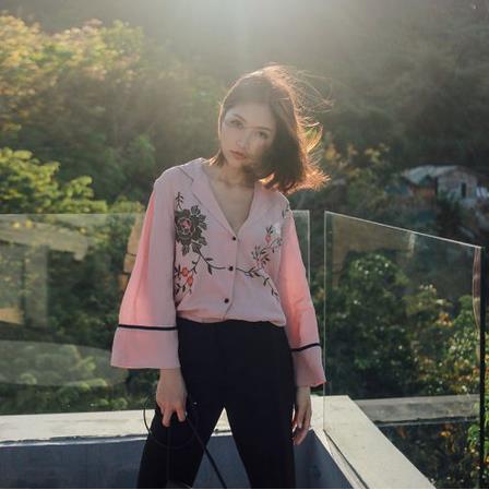 浪漫柔美的粉色, 配合春季浓郁的花朵刺绣,立刻在你的衣橱衬衫中脱颖而出。别具一格的黑色线条撞色,V领的性感设计,翻领的复古,小宽松的随意。轻盈飘逸的涤纶时装面料,令你立刻拥有春夏的质感。