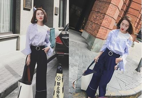 非常潮流的一款搭配,条纹拼接的衬衫复古又时髦,加上露肩的设计,让女生增添了几分性感的味道,下身搭配一条金属圆扣的阔腿裤,白边的设计时尚又好看!