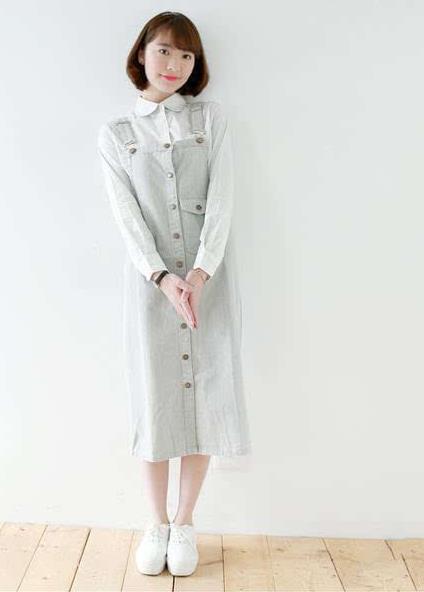 18、学院风细条纹显瘦,中长款牛仔背带裙。