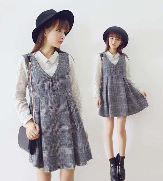 19、甜美学院风复古羊毛呢,背心背带裙格子无袖连衣裙。