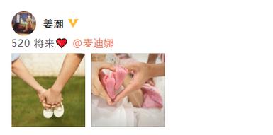 5月20日,姜潮在社交平台发出了宝宝小脚丫的照片,配文:“520,将来”,宣布妻子麦迪娜顺利生产的喜讯。