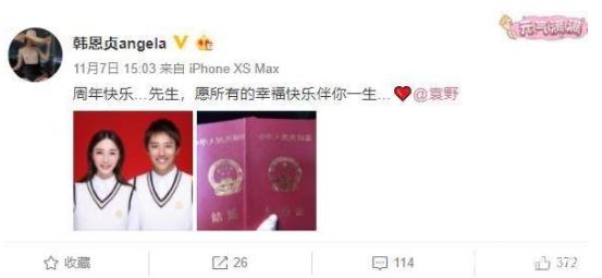 资料显示,袁野的妻子叫韩恩贞,是个演员,代表作品是网剧《欲望香水店》。前不久,韩恩贞还在微博上晒出结婚证件照庆祝结婚周年纪念日。