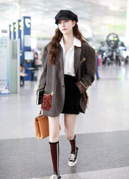 如果你的下半身足够瘦的话,当然还可以选择这种中筒袜。宽大的格子西装外套,从背后看玩起了下体失踪风。