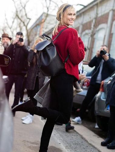 红色毛衣百搭醒目,双肩包又不失俏皮的风格,百搭黑裤从视觉上拉长你的双腿。