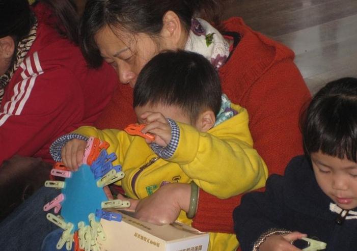 3.游戏开始,家长将自己的宝宝背在背上,宝宝们手中拿好分发的夹子;
