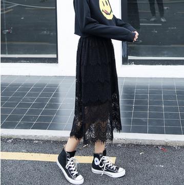 8.长款蕾丝半身裙。这一款半身裙,选用蕾丝这一面料运用到整条裙子上,黑色的基调色,长度在小腿附近,结合流苏这一流行元素。这一条裙子有内衬,透气不透光,防止走光,柔顺不吸腿,可以淑女也可以小活泼的气质。